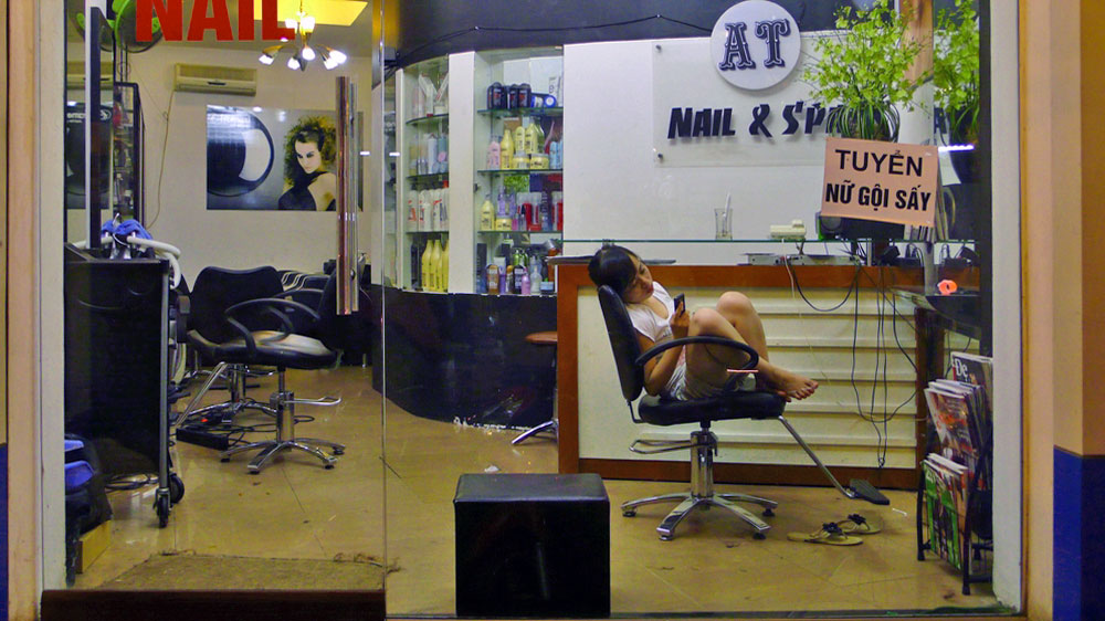 | 21 / 07 / 2010 Cambodge Où est mon pays bercé par ces chanteurs à la voix chevrotante, contemplé par les apsaras millénaires, gardé par la jungle, nourri des rizières fluorescentes? La Perle de l'Asie est une capitale pétaradante presque sans loi aux trottoirs abandonnés aux enfants. Des femmes balaient des avenues à l'abandon. Des jardiniers plantent des fleurs. On fabrique des apparences. Qu'est devenu mon pays, se demande la vendeuse d'essence assise sur le bord de la route? Depuis plusieurs années, elle attend sa sœur qui vient la remplacer à une heure du matin à l'entrée du pont de la nationale six. La mère prend le relai à l'aube et son frère vers midi. Elle fixe l'obscurité rassurante, observe le passage des semi-remorques.